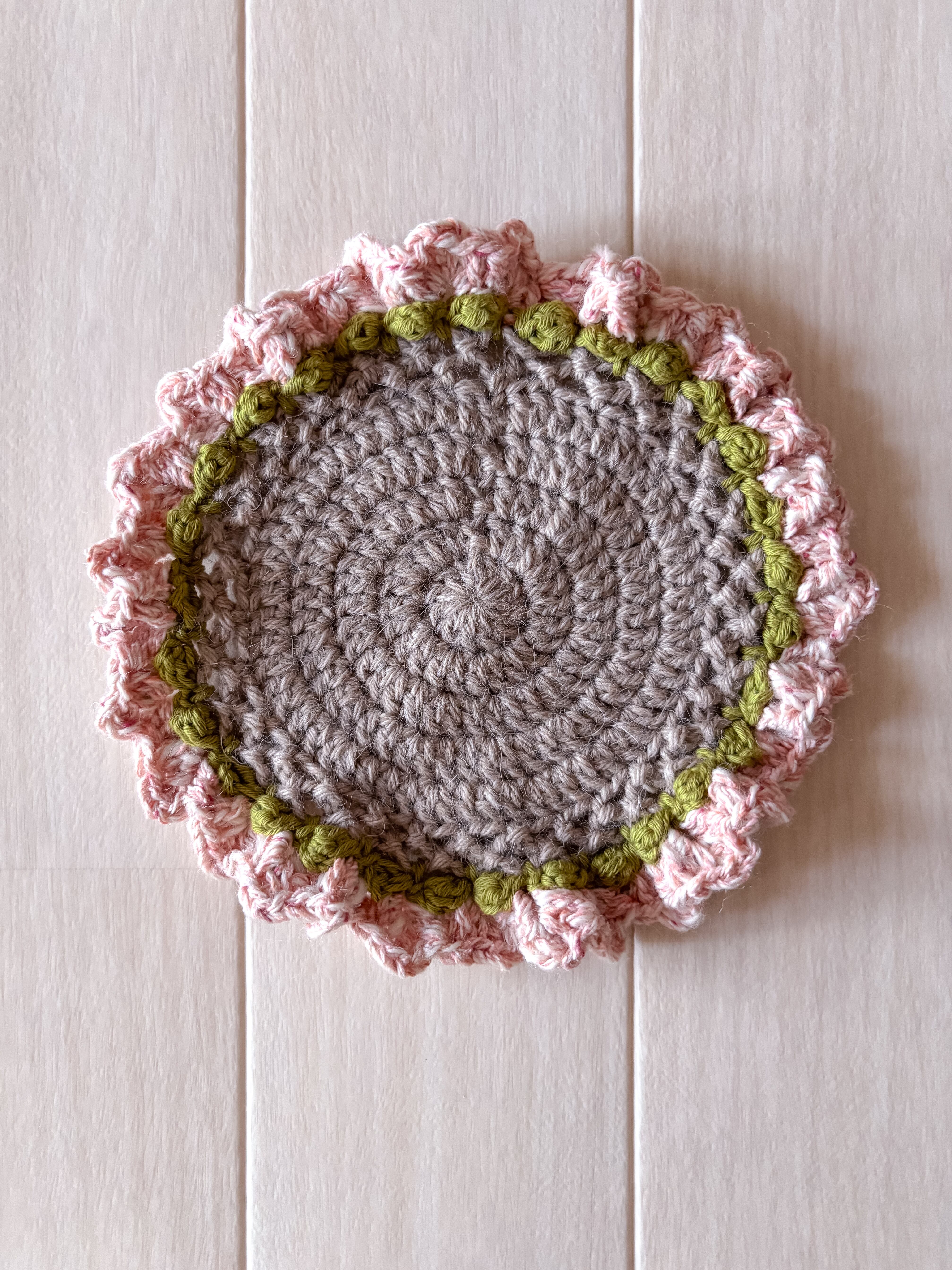 フリルインテリアマットは、花束コースターを大きく編みました。くすみカラーがおしゃれで何を置こうか迷っちゃいますね。